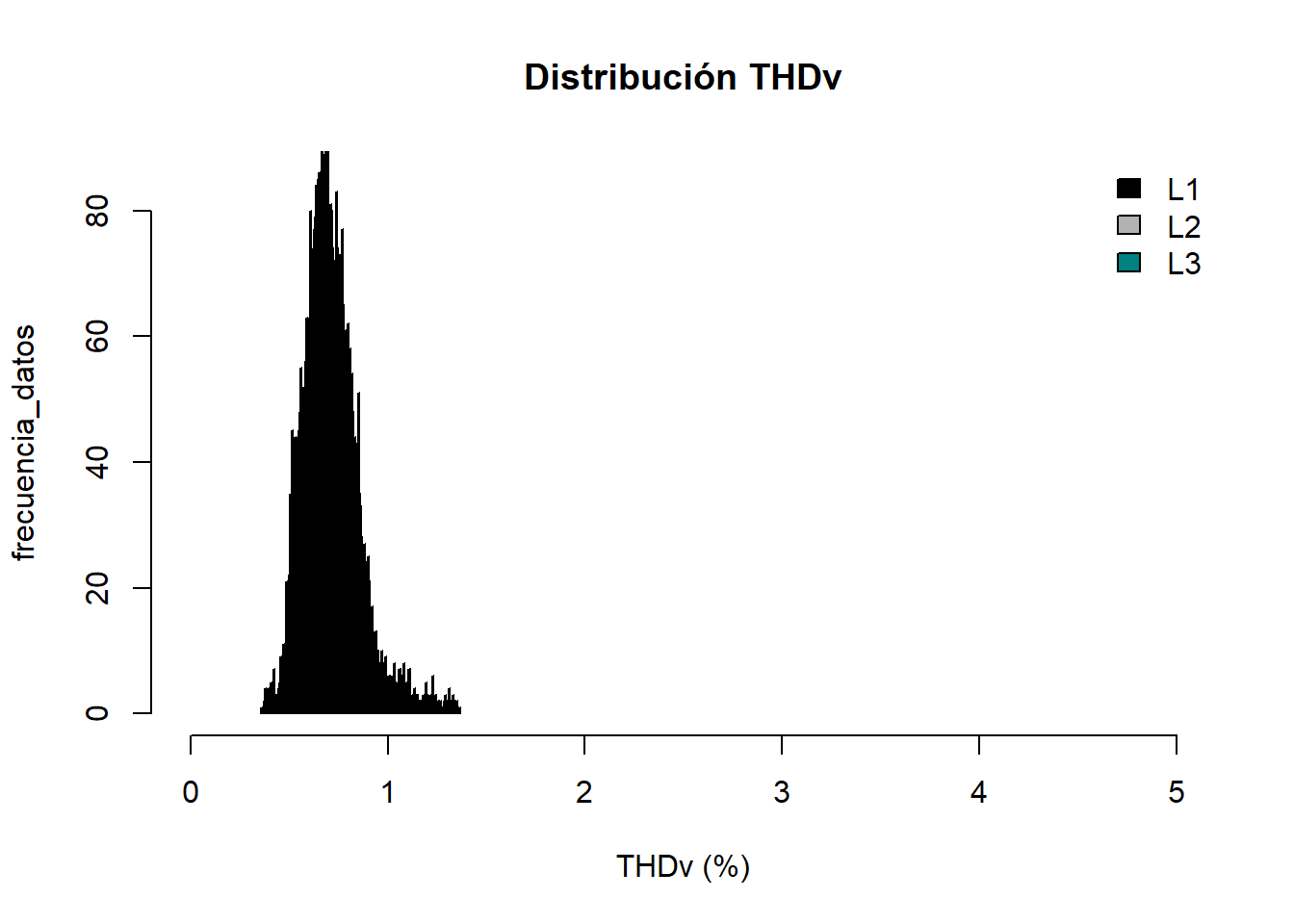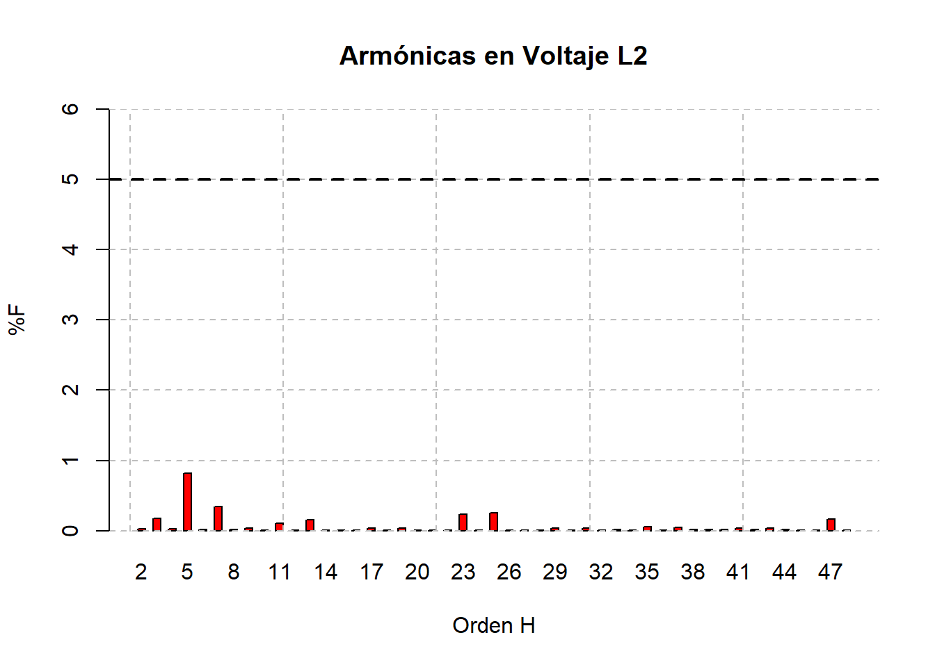 Las armónicas de corriente presentaron un patrón similar al mes anterior, con presencia destacada de las 23ª, 25ª y 47ª, cuyas magnitudes superaron a las armónicas de orden bajo (5ª y 7ª). El THD de corriente promedio fue de 3.7%, dentro de los rangos de los tres meses anteriores que fueron de 4.8, 3.3% y 9.43%, respectivamente. Aunque este nivel no representa un riesgo inmediato, se mantiene una tendencia estable en meses anteriores.